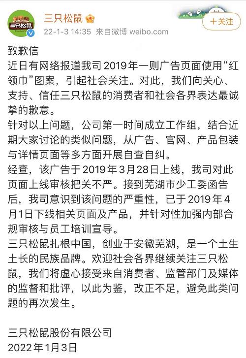 三只松鼠微博1月3日声明称,近日有网络报道公司2019年一则广告页面使用“红领巾”图案,引起社会关注。对此,公司向关心、支持、信任三只松鼠的消费者和社会各界表达最诚挚的歉意。针对以上问题,公司第一时间成立工作组,结合近期大家讨论的类似问题,从广告、官网、产品包装与详情页面等多方面开展自查自纠。