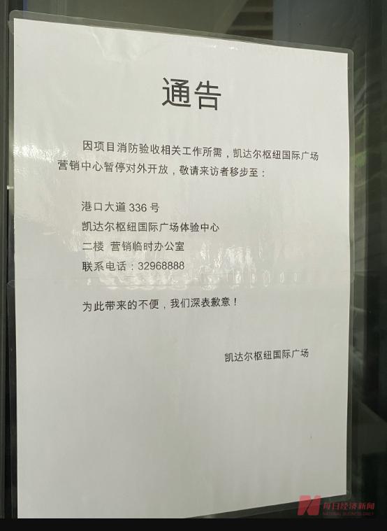 在新塘站出站口旁边,就是凯达尔枢纽国际广场的营销中心,记者走访时看到,营销中心出入口都关着门,也不见灯光。营销中心门上张贴着一份落款为“凯达尔枢纽国际广场”的《通告》,内容为“因项目消防验收相关工作所需,凯达尔国际广场营销中心暂停对外开放。”