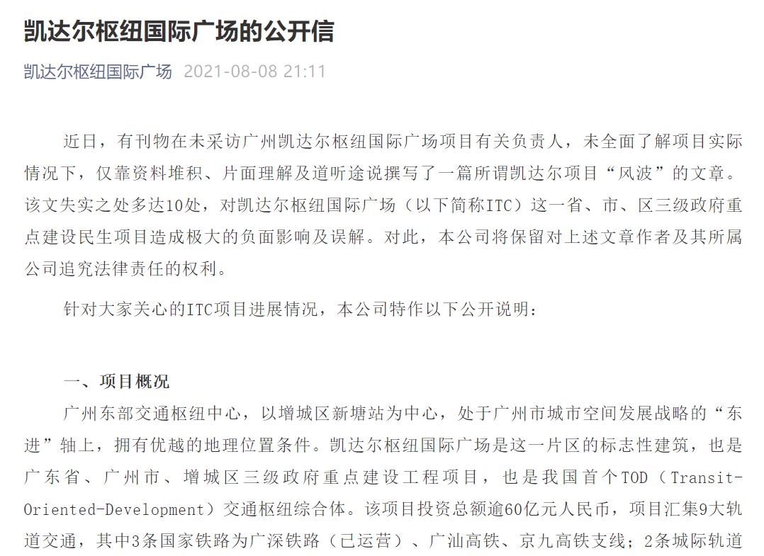《公开信》也表示,项目从战略规划设计到至今建设完善过程中,先后有合作伙伴参与,由于各自战略选择原因,均友好解除合作关系。目前,凯达尔枢纽国际广场项目正在与广州市意向企业进行项目重组,重组工作在广州市各级政府的大力支持下进展顺利。