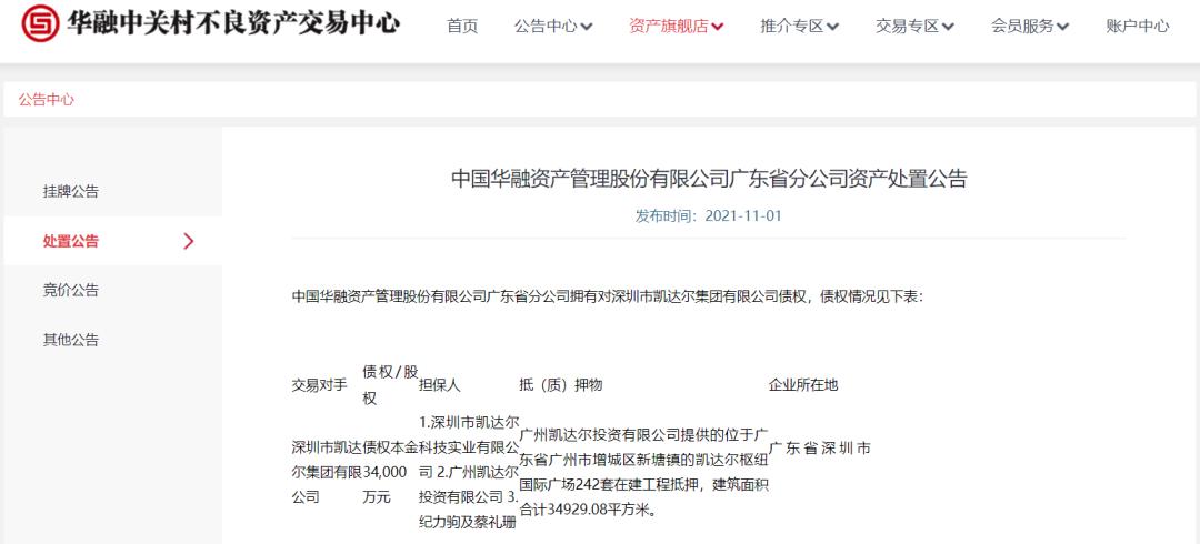 今年7月,中国华融资产管理股份有限公司就发布了广州凯达尔的母公司——深圳市凯达尔集团有限公司(以下简称凯达尔集团)的债权信息。