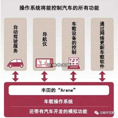 除了方向盘、制动器及加速等控制功能外,地图信息及交通拥堵信息等也统一由Arene负责接收。不管哪个厂家、何种车型,只要配备Arene,就可以使用通用的功能。对车企而言,消费者可以像升级智能手机一样,通过网络更新汽车软件,提高自动驾驶及车载设备的性能。