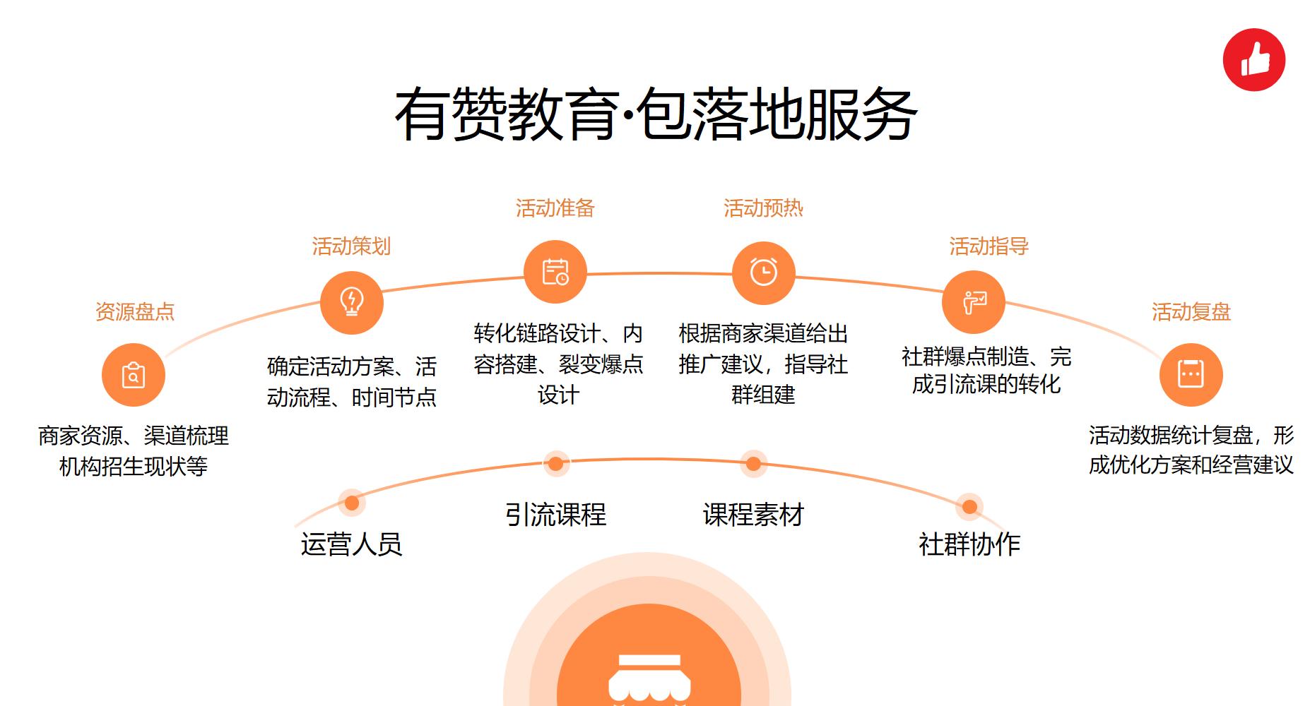 除了工具之外,有赞教育还提供了针对性的诊断、以及包落地的服务运营。基于机构的一次招生活动作为切入点,从资源盘点、问题诊断开始,提供针对性的招生活动设计。在整个活动流程中,有赞教育会从运营人力、课程设计和社群协作,几个维度提供资源和支持。