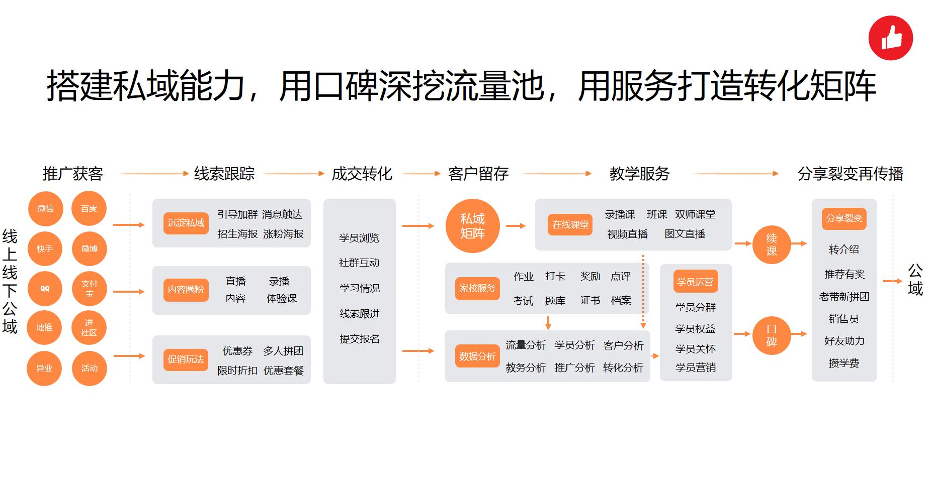 此外,其指出,私域运营正成为以学生需求为主的新教育运营基础,正在由“以课程销售为核心”向“以学员需求为核心”的转变。针对私域的布局,并非是一个团队、一套工具能够完成的简单布局,而是必须由一把手推动的系统性工程。