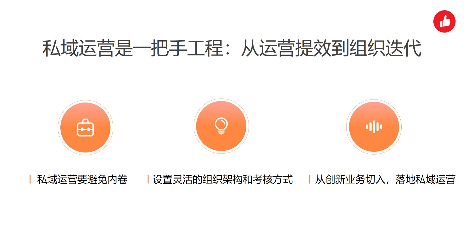 最后,在驱动整个组织去迭代的过程当中,是有一些方法可循,比如从创新业务开始“试点”落地私域运营,反向会给主营业务团队带去认知迭代和冲击。同时,需要给创新的业务和模式足够的空间、资源、耐心,包括信任,犯错的信任,然后让它求变,让它快速的迭代。
