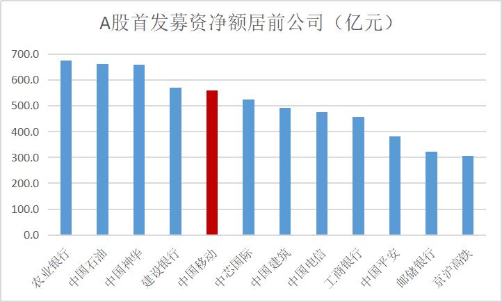 在A股近32年历史上,中移动募资额(560亿元)排在第五位,前四是农业银行,募资净额676亿元;中国石油募资净额662亿元;中国神华募资净额660亿元;建设银行募资净额571亿元。