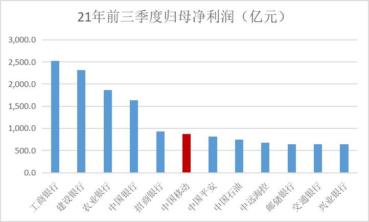 至于净利润总额,中移动显然也不低。2021年前三季度,中移动归母净利润870亿元,放在A股中要排在第六,超过中国平安,仅仅低于国有四大行+招行,这五大银行。