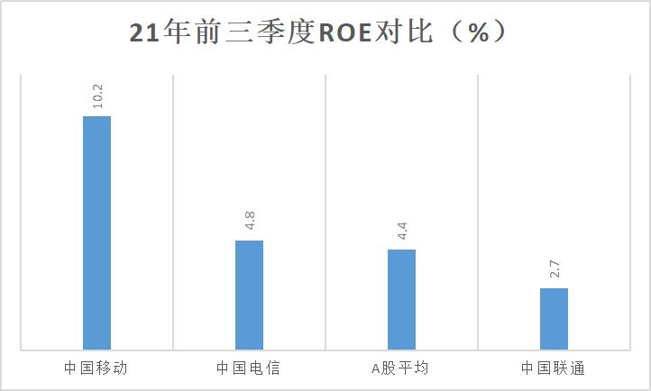 统计显示,至2021年三季度,中移动ROE(平均)为10.2%;而A股所有公司同一周期ROE平均值为4.4%,中值也是6.4%而已,都大大低于中移动的ROE。中国电信去年前三季度4.82%,中国联通同期为2.7%最低。
