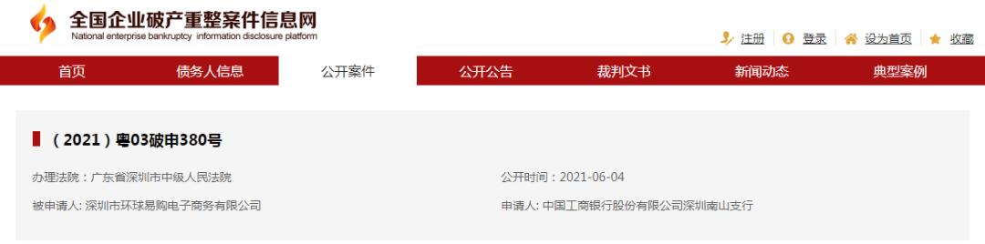 根据公开资料显示,深圳市环球易购电子商务有限公司于2021年6月4日被申请破产,申请人为中国工商银行股份有限公司深圳南山支行。