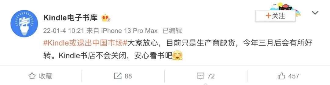 2022 年开工第一天大早,有网友爆料 Kindle 京东自营店全线缺货,消息很快冲上微博热搜榜首。@Kindle 中国微博账号下,网友们在其最近发布的一条博文下集中提问:Kindle 是否要退出中国市场?电子书城还能不能用?