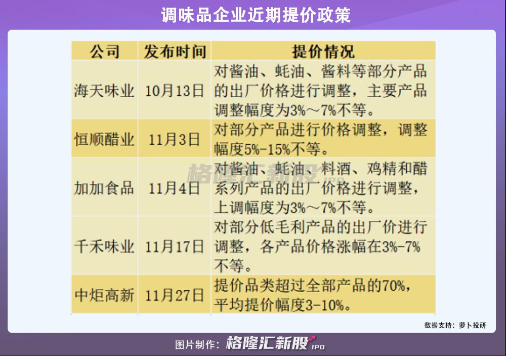 去年10月,由龙头海天味业带头提价,中炬高新、恒顺醋业、加加食品、千禾味业等相继响应。