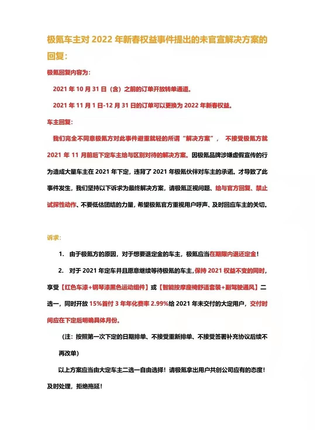 目前车主们的联合诉求是,想要退定金的车主,极氪应当在期限内退还;对于愿意购车的车主,WE版和YOU版车主,应当保持2021年权益不变的同时,同样享受2022年的新春权益。