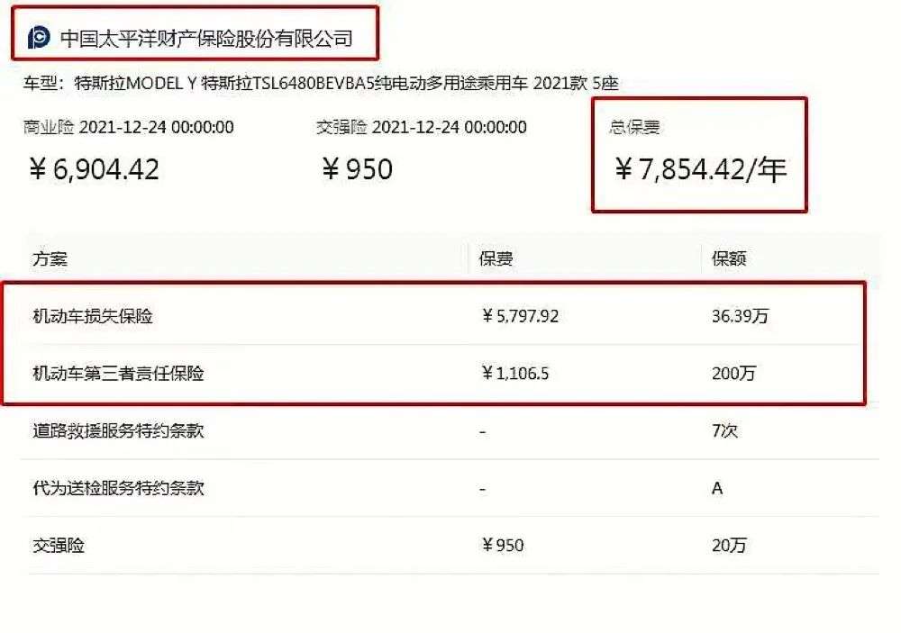 2021年12月24日,也有网友在某论坛上发布了特斯拉Model Y长续航车型的保单,保单上面的总保费为7854.42元/年,其中机动车损失险的保费为5797.92元,保额为36.39万元,车损险的价格比2021年12月28日的报价的一半还要少。
