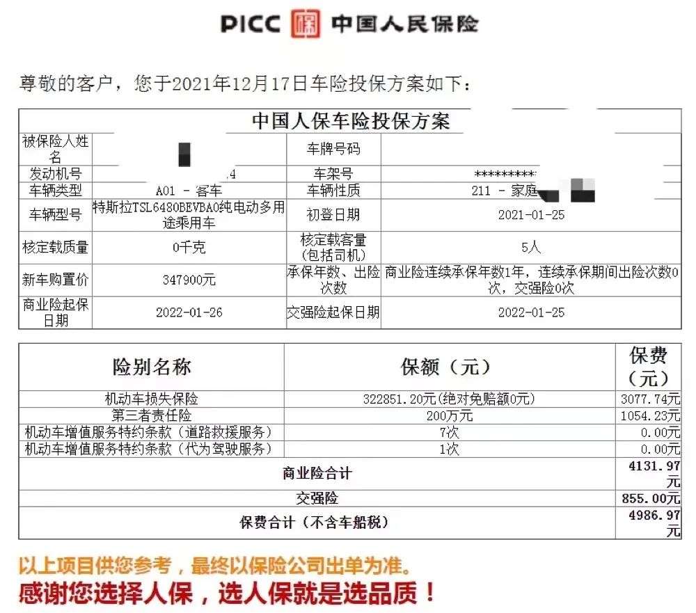 ▲2021年12月17日Model Y长续航版的保险价格(图片来自网络)
