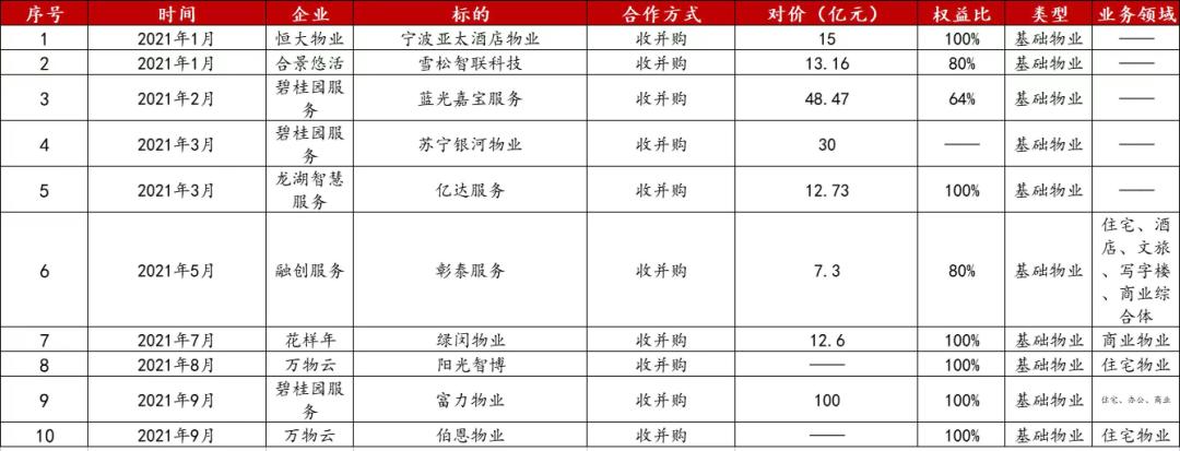 年内,碧桂园服务、万物云、世茂服务、金科服务等多家企业不断出手优质标的,高交易额、高频次;并刷新业内最贵收购单价记录(碧桂园服务更是斥资百亿收购富力物业);亦出现“小吃大”的经典案例,合景悠活拿出1/3募资额收购斥资13.6亿收购雪松智联。