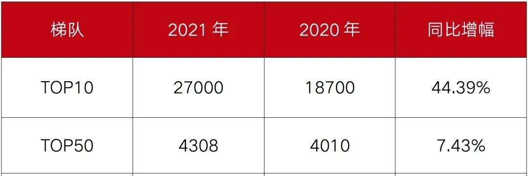 与2020年相比,TOP10门槛提升8300万方,增幅为44.39%;TOP50门槛提升298万方,增幅达7.43%。较2020年,TOP10的门槛增幅最大,头部企业的提升度进一步加速。
