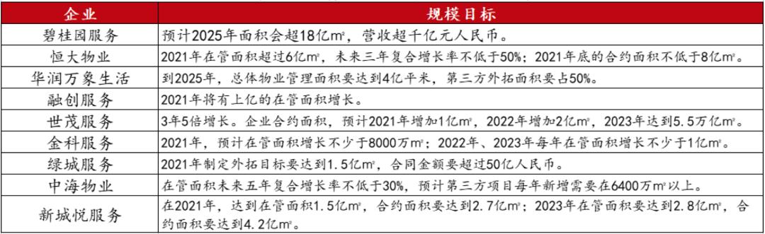 头部企业更是定下高达数亿的增长目标,恒大物业2021年在管面积将破6亿㎡,合约面积不低于8亿㎡;绿城服务合约面积将新增1.5亿㎡,碧桂园服务则表示2025年规模超18亿㎡,营收要超过千亿元。世茂服务亦提出3年5倍计划,2021年增加合约面积1亿㎡,预计2023年合约面积达5.5亿㎡。