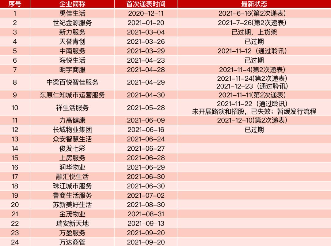 在市场的冰冻期,监管层考虑、投资人离场心态、母公司急需资金纾困以及企业自身意愿的多重因素影响下,2021年下半年待上市物企被摆上货架出售、推迟上市或者已经通过聆讯也暂停上市。