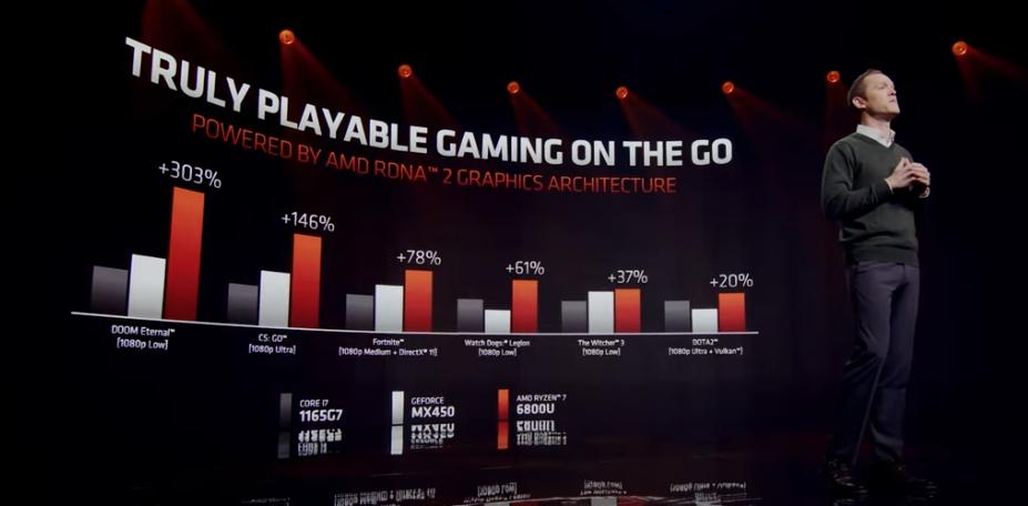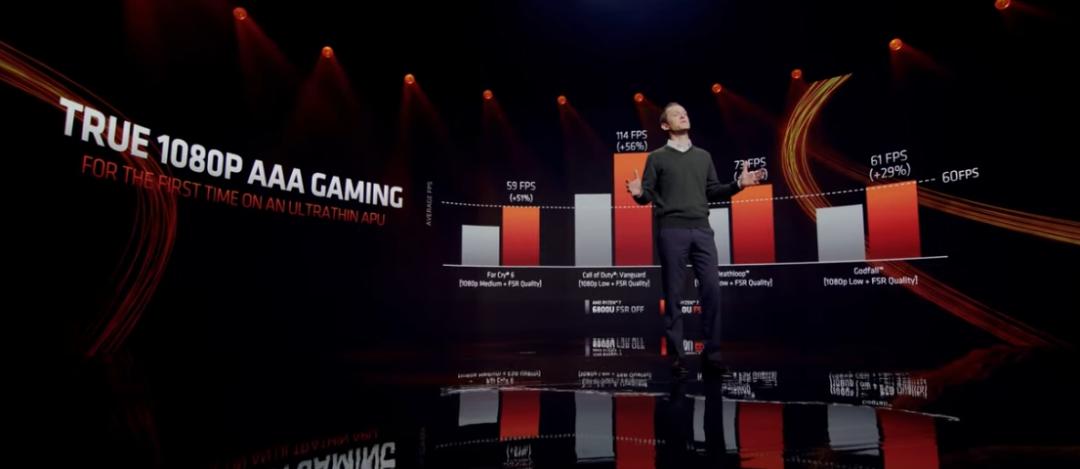 在实际应用中,锐龙6000系列移动处理器的视频解码性能最高提升了69%,3D渲染性能提升了125%,而1080P下的游戏性能提升幅度更是达到了100%。