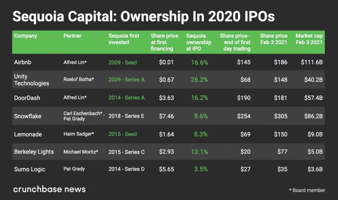 图 |被投公司 IPO 时红杉所占股份排行(自 2000 年后)图片/数据来源:crunchbase