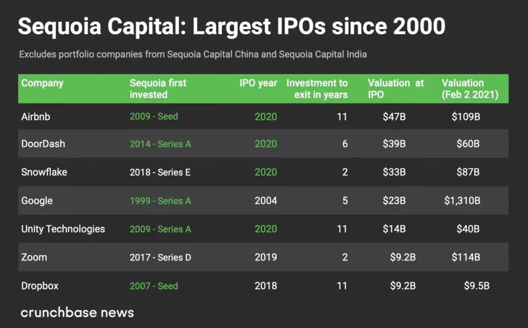 图 |红杉被投公司最大 IPO 排行(自 2000 年后)图片/数据来源:crunchbase