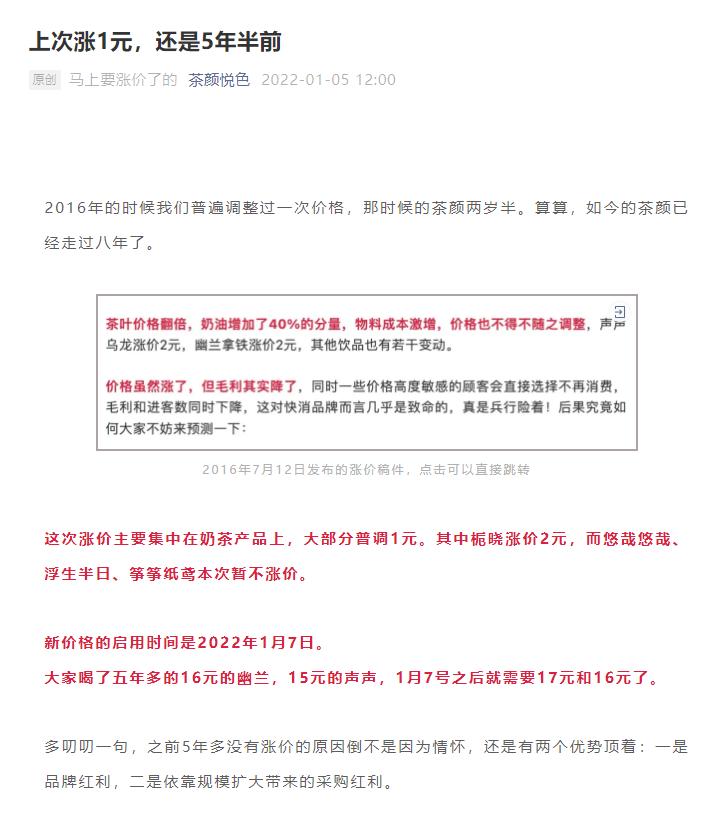 2022年1月5日,茶颜悦色在其微信公众号宣布,自2022年1月7日开始,品牌大部分奶茶产品上涨1至2元。其中栀晓涨价2元,茶颜悦色的王牌产品“幽兰拿铁”和“声声乌龙”,此后售价将为17元和16元。而悠哉悠哉、浮生半日、筝筝纸鸢本次暂不涨价。