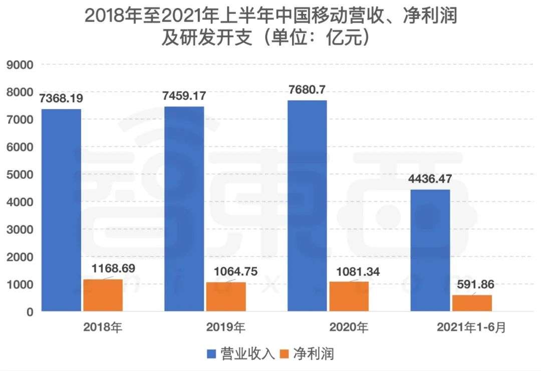 2018年至2021年上半年,中国移动的净利润分别为1168.69亿元、1064.75亿元、1081.34亿元、591.86亿元。