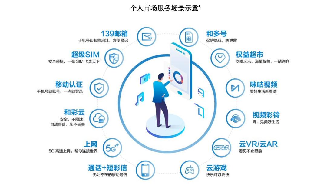 在个人市场,中国移动结合用户需求提供多形态智能终端、多样化组合套餐,并且打造了“和彩云”“云游戏”“云VR/云AR”等一系列特色产品。