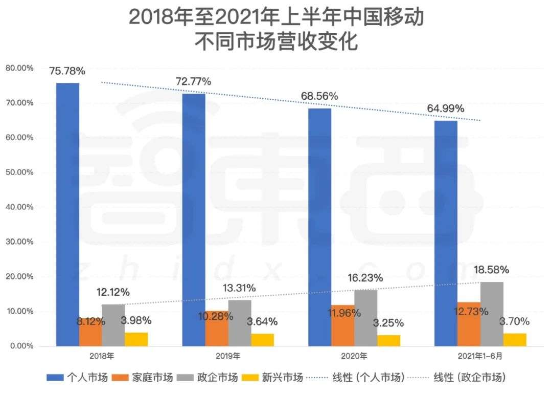 中国移动的个人市场收入占比逐年降低,2018年至2021年上半年从75.78%降低到64.99%,政企市场占比变大,从12.12%上升到18.58%,中国移动成为智慧城市领域的一大主要玩家。