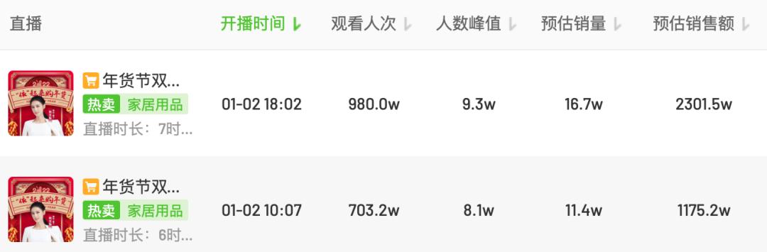 以黄圣依直播间为例,杨子黄圣依夫妇在1月2日开启了两场“年货节”直播。据飞瓜数据显示,总直播时长近14小时,预估销售额达3476.7万。