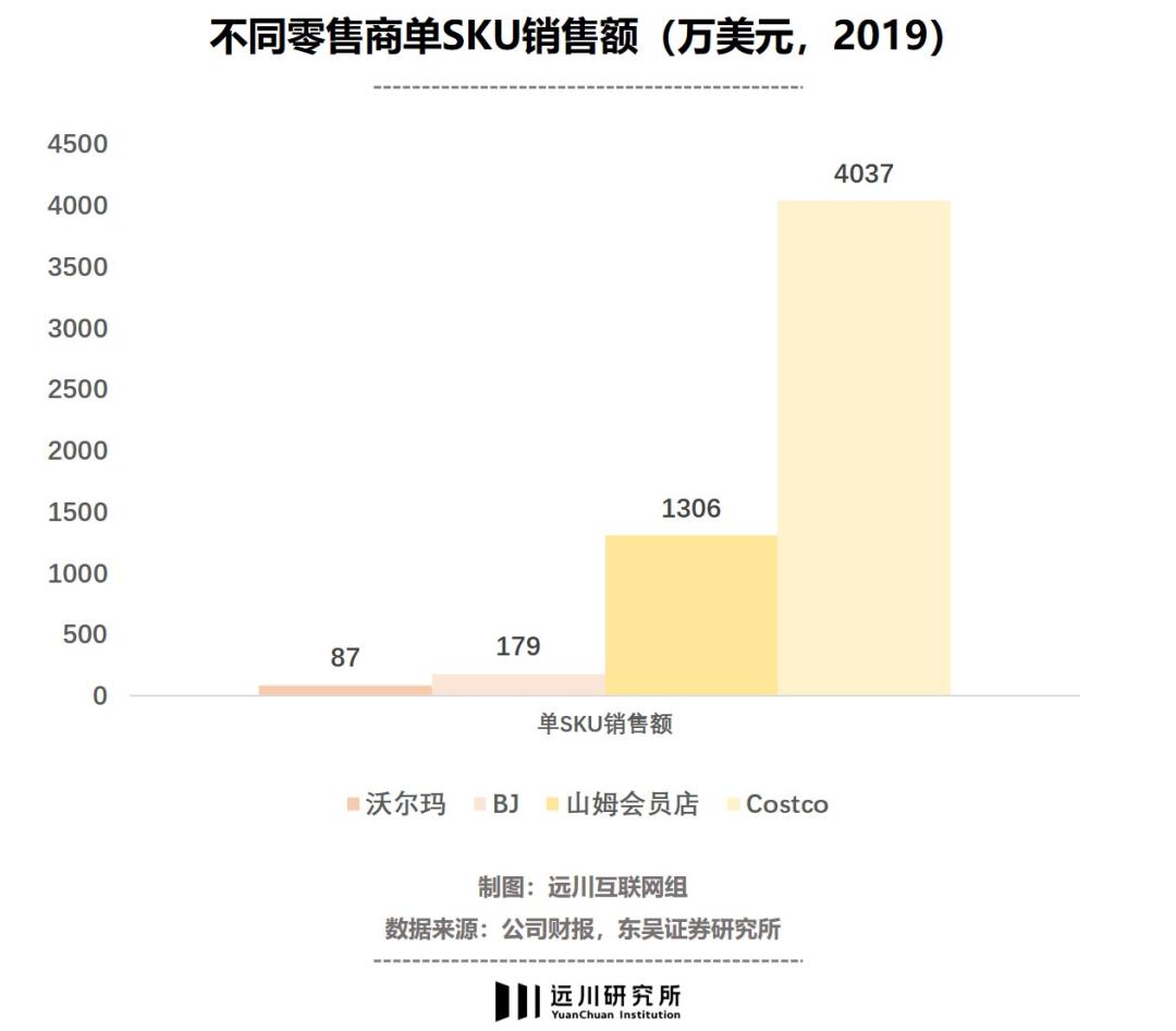 Costco的SKU在3700左右,只有沃尔玛(2万)的五分之一。品类虽少,单品规模却高一筹。2019年,Costco单个SKU的销售额超过4000万美元,远高于沃尔玛的87万美元。