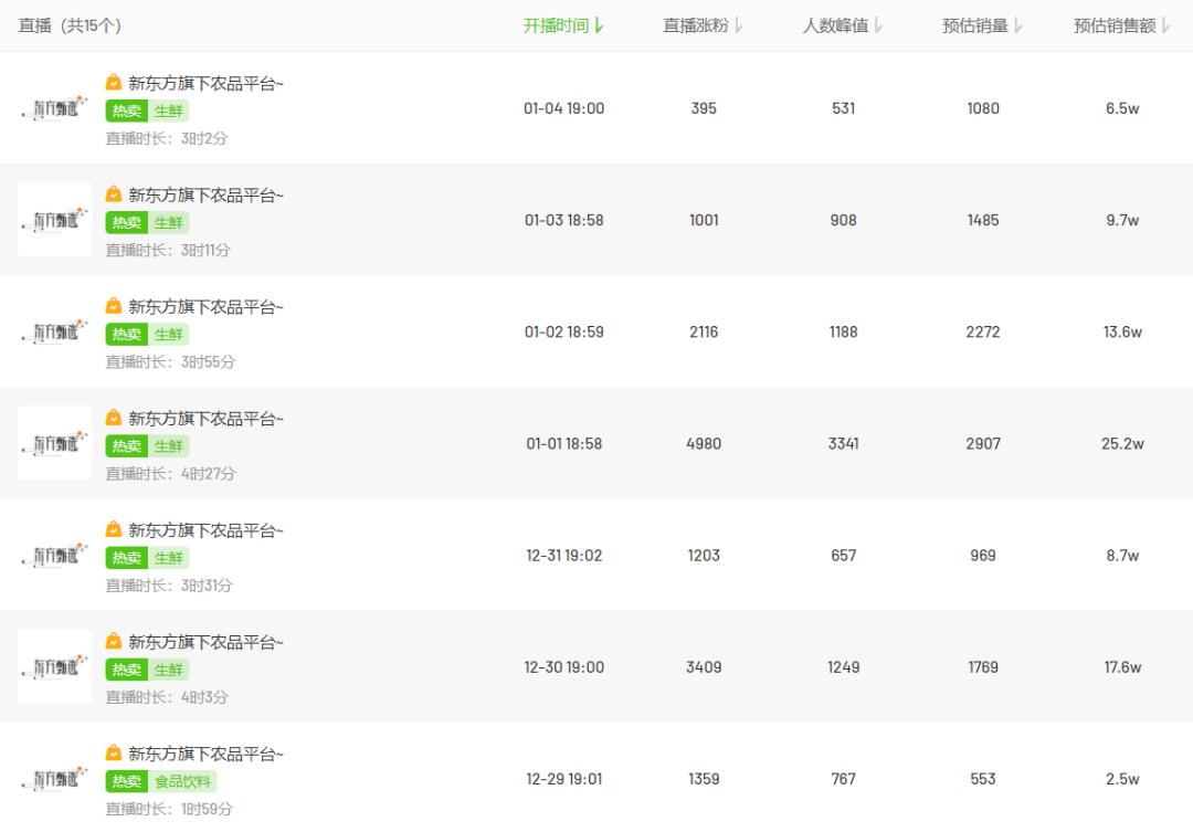 从直播数据来看,从12月28日起密集开播,东方甄选基本保持每天3到4个小时的直播时长。但直播成绩并不亮眼,场观人次基本不过10万,销售额在20万上下。飞瓜数据显示,从12月29日到1月4日的6场直播,总计销售额不足90万。