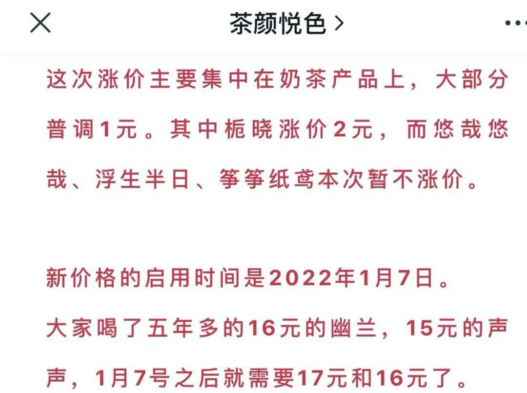 36氪获悉,茶颜悦色在其微信公众号宣布,自2022年1月7日开始,品牌大部分奶茶产品上涨1至2元。茶颜悦色的王牌产品“幽兰拿铁”和“声声乌龙”,此后售价将为17元和16元。而悠哉悠哉、浮生半日、筝筝纸鸢本次暂不涨价。对于涨价原因,茶颜悦色表示,市场上原材料和其他成本逐年走高,之前积累的那些红利也扛不住一系列的叠加成本。