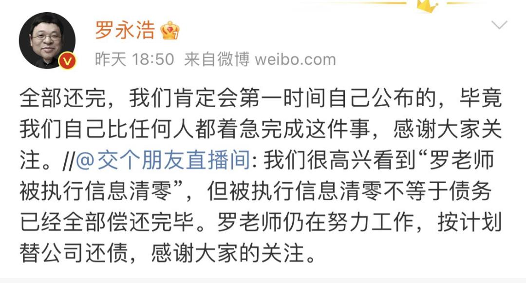 对此,罗永浩在其微博账号回应称:“全部还完,我们肯定会第一时间自己公布的,毕竟我们自己比任何人都着急完成这件事,感谢大家关注。”微博@交个朋友直播间回应表示,我们很高兴看到“罗老师被执行信息清零”,但被执行信息清零不等于债务已经全部偿还完毕。罗老师仍在努力工作,按计划替公司还债,感谢大家的关注。