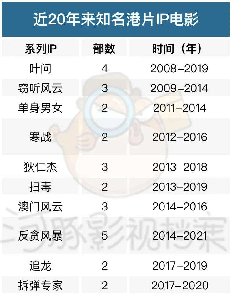 直到成龙的《神话》《宝贝计划》、周星驰的《功夫》《长江七号》等影片开始在内地大获成功后,香港电影及影人开始逐渐在内地市场站稳。新世纪后第一个经典IP电影《叶问》也开始出现。