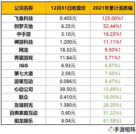 受恒指大盘连累,港股中的游戏股表现整体来说不尽人意。在手游矩阵 整理的名单中,仅四家游戏公司的全年累计涨幅超过10%。其中,飞鱼科技的涨幅主要靠腾讯的两次增持,但是不得不说,飞鱼科技的研发能力还是值得肯定,再加上旗下知名IP《保卫萝卜》《神仙道》等;创梦天地从6月份开始拉升,不少证券公司看好创梦天地的主要原因是其产业价值链不断上移,积极转型为游戏开发商,再加上与腾讯的深度绑定,可谓钱景极佳;中手游在2021年的表现可谓说得上是非常亮眼,其全年涨幅可以说是实打实用产品证明出来的,在上半年与字节跳动合作的《航海王热血航线》一度成为现象级游戏,将其研发实力展现了出来,此外,中手游在全球市场发行的《新射雕群侠传之铁血丹心》也取得了不错的表现,这也让改变了外界对中手游是发行商的固化印象。