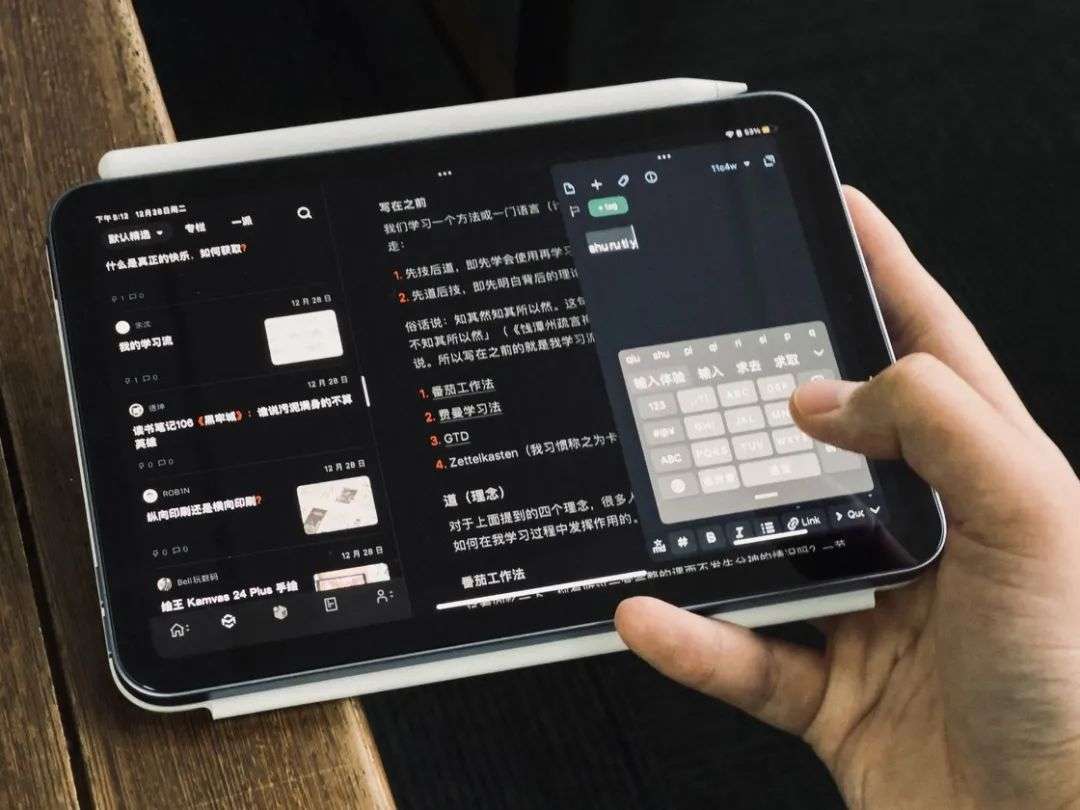 输入体验也是记录过程中十分重要的一环。触屏打字是有尺寸限制的,以往使用 iPad Pro 12.9 吋,捧在手里打字就是一件痛苦的事情,我只有放在桌上当成一个硕大的键盘来打字才能找到点舒服的感觉。