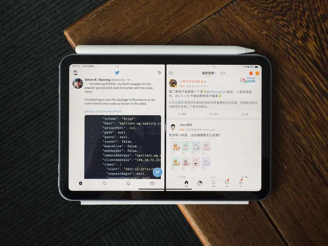 究其原因主要是大部分的信息流都是竖直的,而横屏状态下的 iPad mini 6 分屏更接近于两个正方形,在显示竖屏信息流上就会显得比较局促,一页只能塞下一条微博,你需要频繁的滑动来浏览信息。