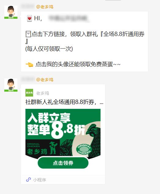每位用户在进入一家门店的社群之后,店长会赠送“新人入群福利”:一张 8.8 折的优惠券,以及一份免费蒸蛋,在下次点单时可以抵用。