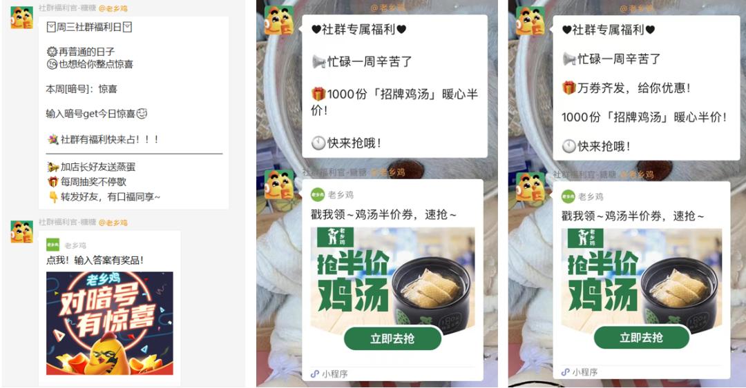 在完成私域环境搭建后,老乡鸡也是在慢慢摸索运营方式,不断优化自己的运营动作: