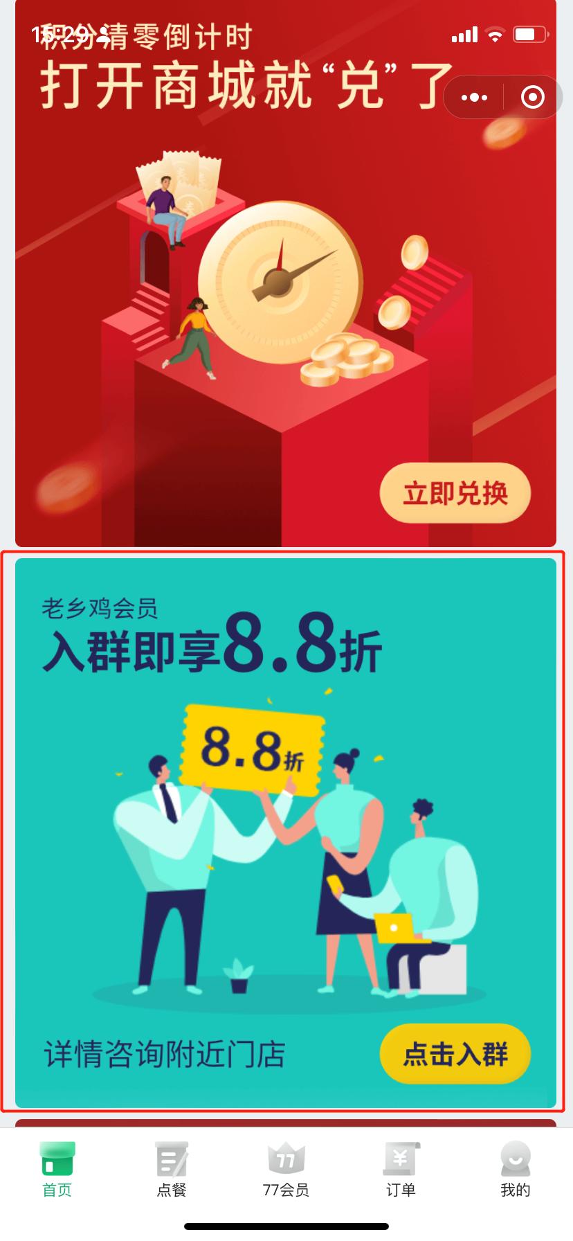 为了降低用户的决策门槛,老乡鸡主要通过社群里发放优惠券和小程序中的“ 77 会员卡”,来提升转化率和复购率。