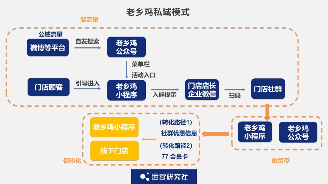 同时运营社发现,老乡鸡的私域运营做得也很不错。老乡鸡的私域模式,也可以用“私域 3 x 3 模型”来理解,共有聚流量、做留存、促转化三个环节。