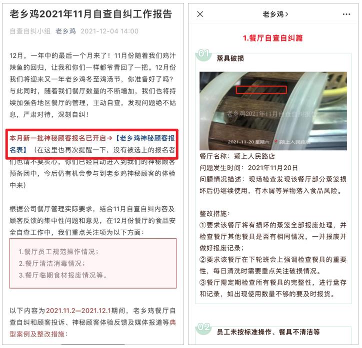 第二,服务号里有一个特色栏目是“每月自查自纠”。老乡鸡每个月会主动召集一批顾客去检查餐厅的卫生、产品和服务,并且在推文中报备顾客反馈的餐厅管理问题、相应的整改措施以及整改过后的现状。