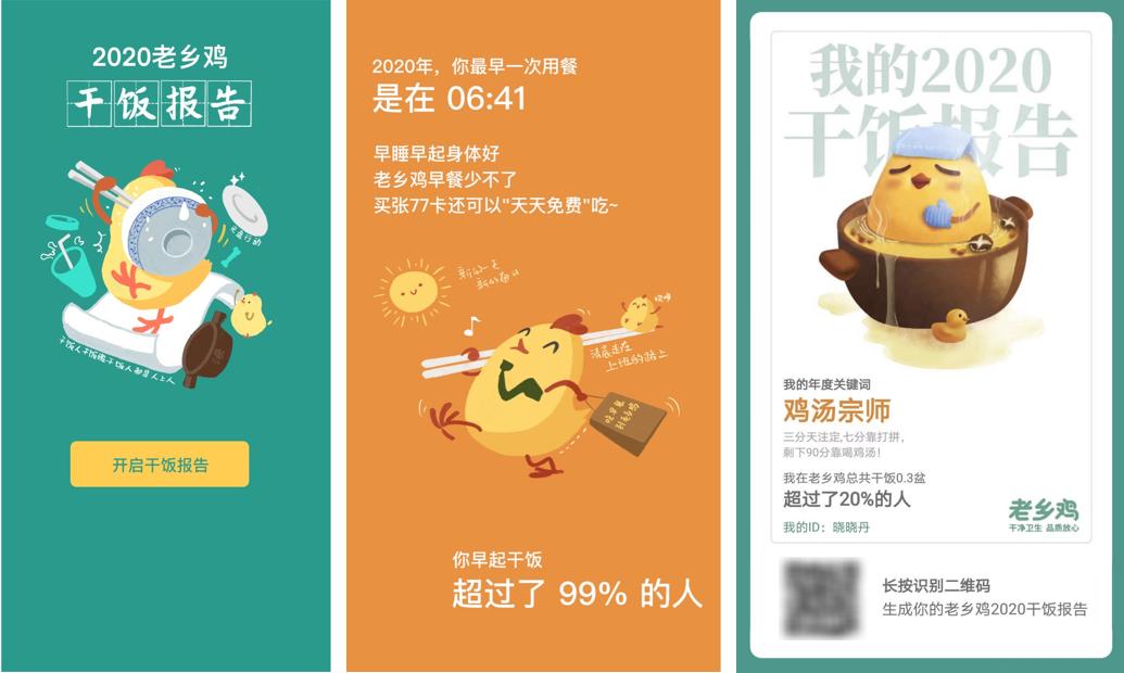譬如,在 2020 年底时,老乡鸡在小程序里上线了一个“年度干饭报告”新功能——