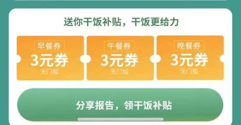 用户如果分享自己的“干饭报告”,还能拿到 3 张无门槛优惠券。