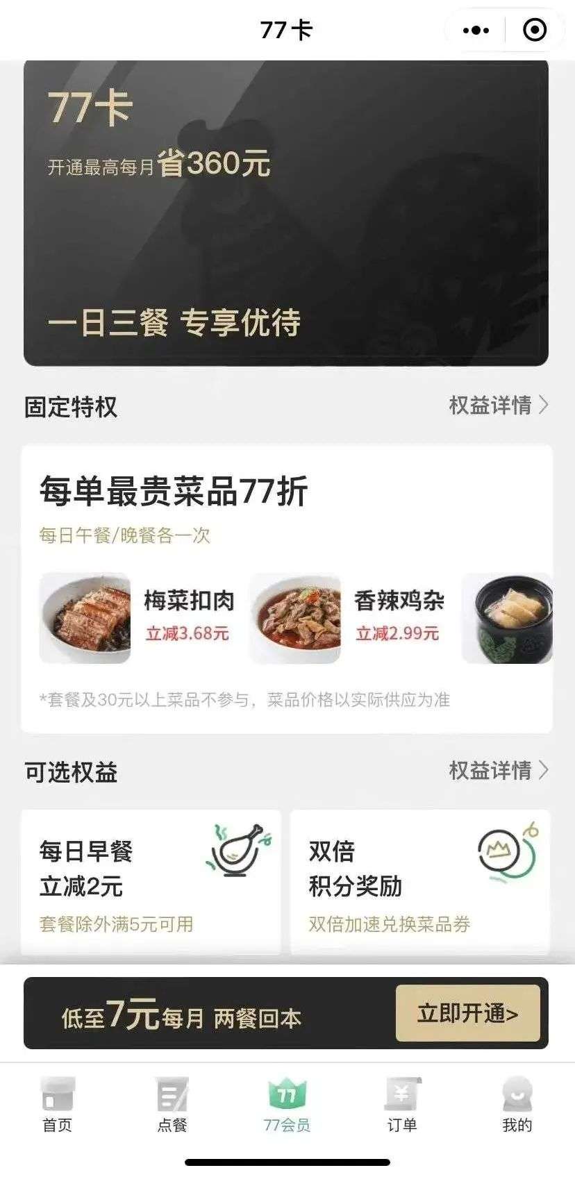 在 2020 年底,老乡鸡推出了“ 77 会员卡”——沿用了外卖会员制度,每个月充值 7 元,就可以享受每单最贵菜品 7.7 折、每日早餐减 2 元、双倍积分等权益。