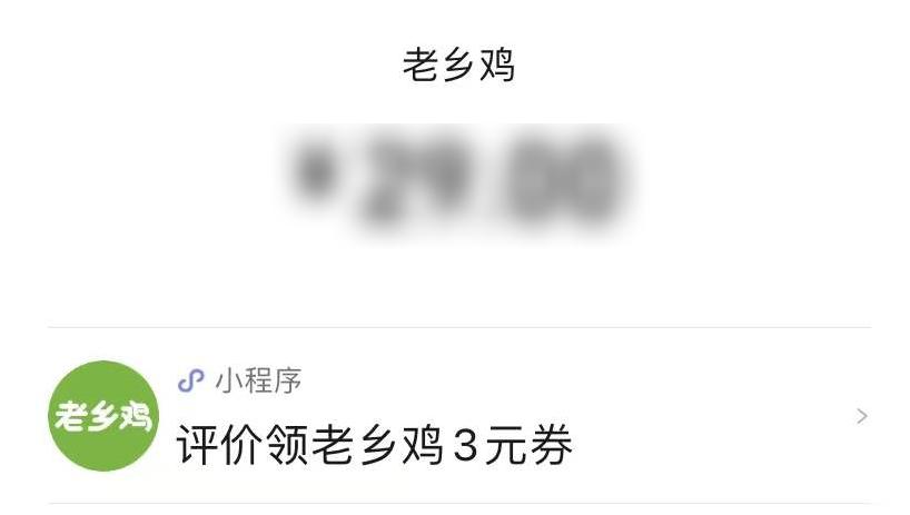 在线下门店,用户不必通过扫码才能点单,但是用微信支付结完餐费后,会弹出“评价领老乡鸡 3 元券”的提示,引导用户进入小程序进行评价。