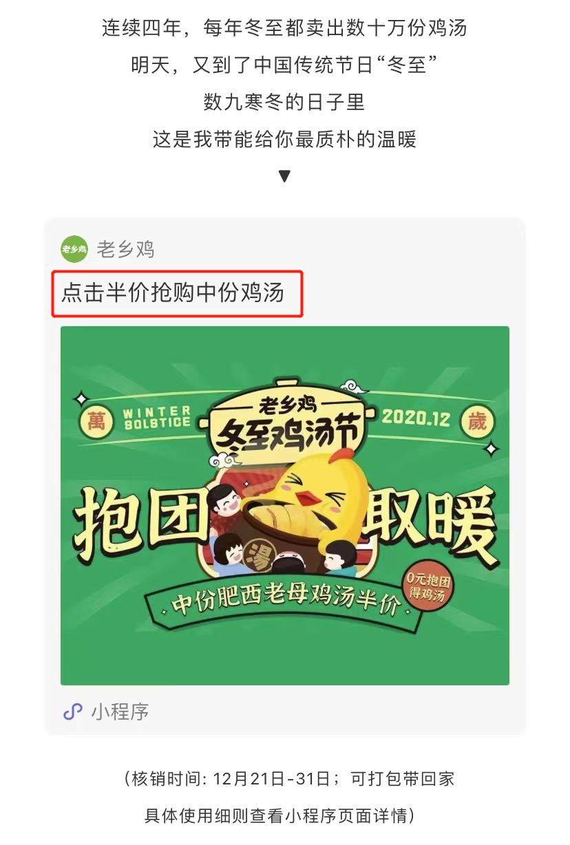 老乡鸡还会推出一些节日活动,例如冬至鸡汤节等等。通过在公众号文章里内嵌小程序,再用“半价抢购中份鸡汤”这样的福利关键词来吸引用户点击。