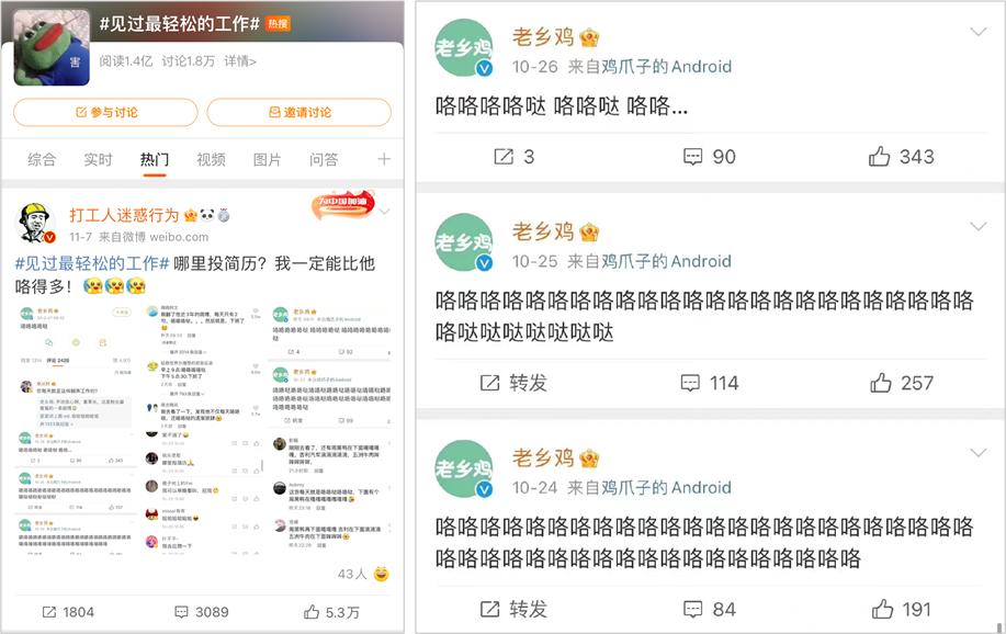 去年年底,在微博热搜话题#见过最轻松的工作 下,老乡鸡官博因为每天在微博上发“咯咯哒”被搞笑博主提名。