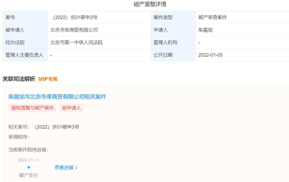 1月5日,天眼查APP显示,北京寺库商贸有限公司司法风险中新增破产审查案件,且已进入破产重整阶段,申请人为柴晨旭,经办法院为北京市第一中级人民法院。在此之前,寺库共有7笔股权被冻结,涉及金额累计达1.53亿元。