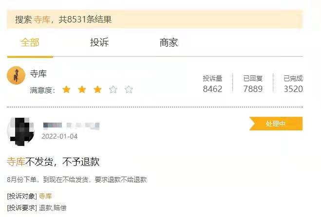 在黑猫投诉平台上,关于寺库的投诉量超过8000条,投诉内容包括售卖假货、鉴定出错、配送超时、不发货不退款等等。